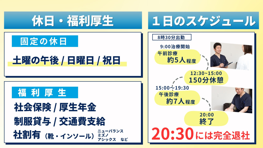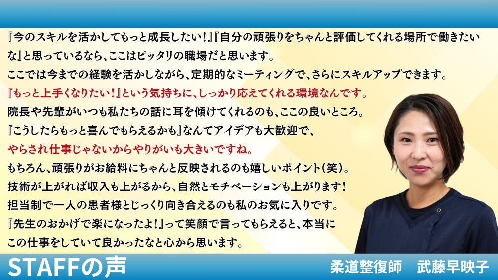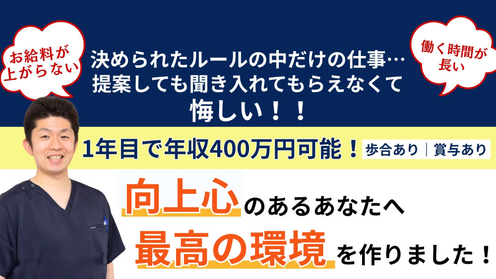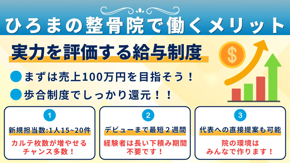 ひろまの整体院 【駅近・通いやすい環境】 仕事もプライベートも大切にできます。 【正当な評価&高待遇】 あなたの頑張りはしっかり給与に反映! 【担当制】 |