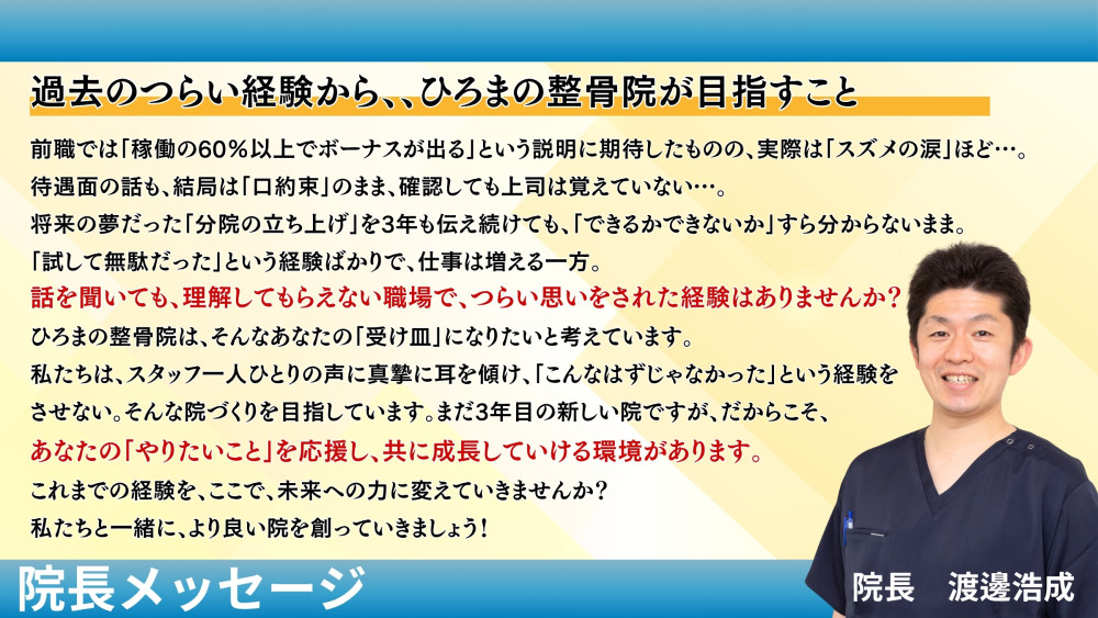 ひろまの整体院 【将来のキャリアアップも応援】 沢山稼ぎたい 院長が実際に行っている経営塾に参加可能 |